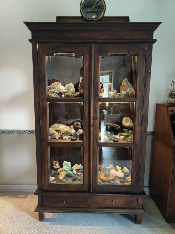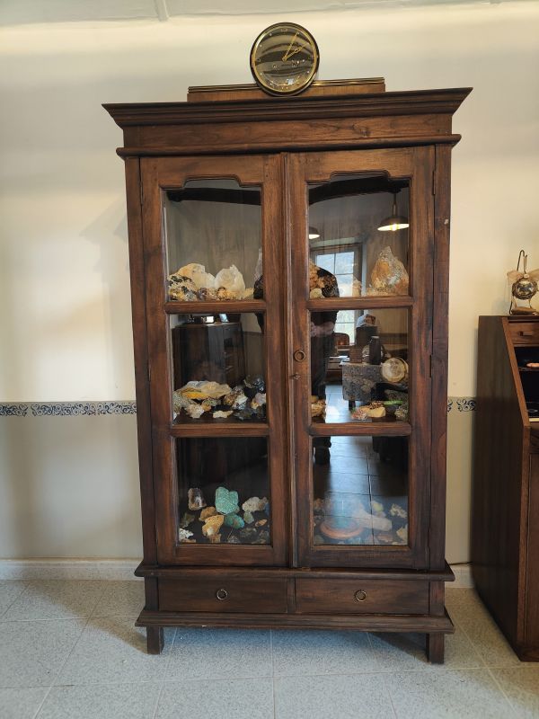 Toen we in Nederland waren hebben we een kast gekocht, waar jullie al eens foto’s van gezien hebben. Die kast heb ik voorzien van verlichting en die gaat automatisch om 18 uur aan en om middernacht weer uit, of ik bedien met mijn telefoon. Het is nu een antieke kast met verlichting en WIFI. In de kast staat nu een deel van onze stenen en mineralen verzameling. Om alles uit te stallen hebben we in ieder geval nog eenzelfde kast nodig.
