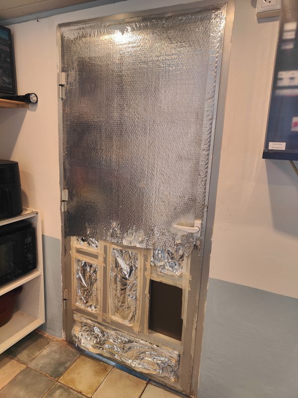 Helaas denken de katten, die ook regelmatig binnen zijn, dat het een enorme krabpaal is. Tot zo hoog als zij kunnen krabben is de isolatie weg. Ooit moet er een nieuwe deur komen, maar voor nu moest er ook iets aan gedaan worden.