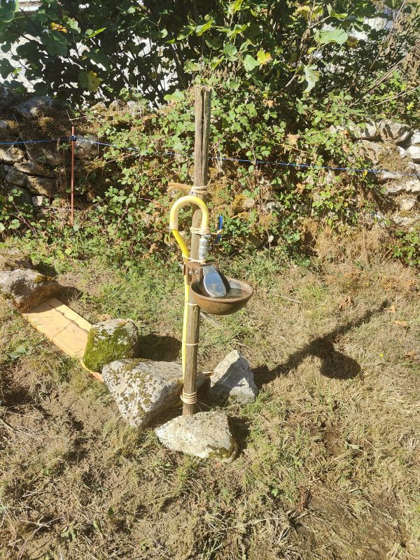 Ook de paarden die bij ons lopen hebben dorst. In ons bos hebben wij twee bronnen waar zo het water uit de grond komt, helaas staan die ook voor 98% droog. Voor de paarden heb ik op verzoek van de eigenaar iets gemaakt voor de paarden. Op een paal in de tuin waar de paarden lopen, heb ik een paal gezet met een drinkbak die alleen water geeft als er gedronken wordt (weet niet hoe je zo’n ding noemt) die is aangesloten op de waterbron van ons huis. Zo kunnen die paarden toch drinken.