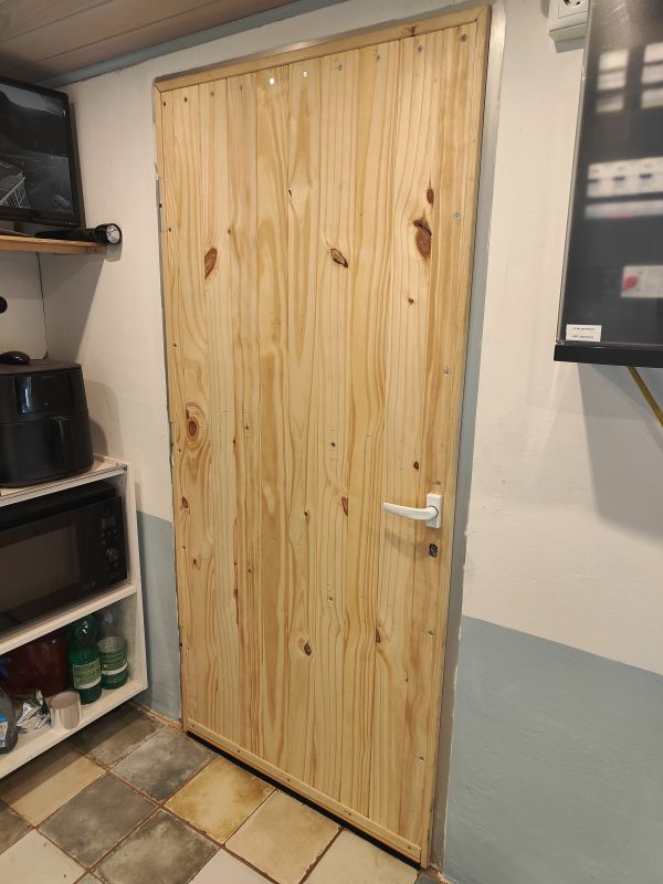 Met een pakket dunnen schroten wat we nog hadden liggen, heb ik de deur betimmerd. Is het nu onze favoriete deur? Nee, maar het is wel een stuk netter dan wat de katten er van gemaakt hebben. De deur is nog niet helemaal af en hij moet nog een lik verf hebben.