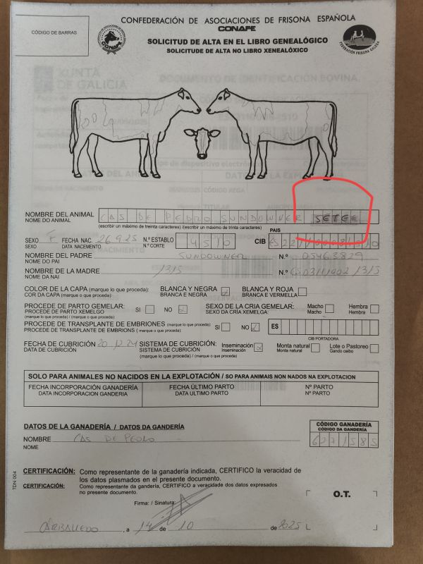 Nu is er pas een kalfje geboren waarvan ik de naam wilde bepalen. Dat was geen probleem. Het kalfje heeft de naam Sete, wat zeven in het Galego is. Volgens mij de meest passende naam voor dit kalfje.