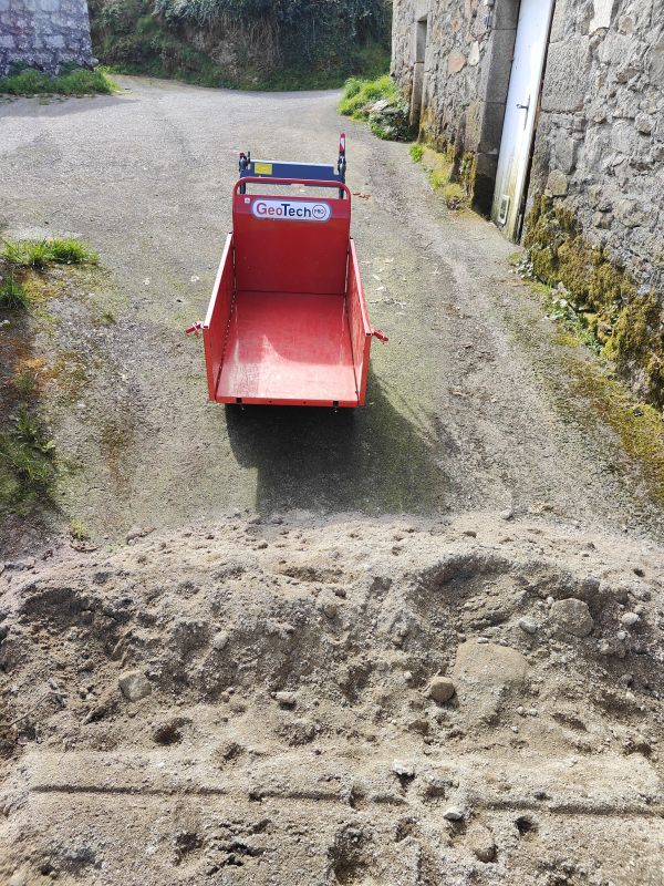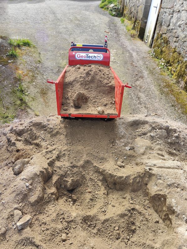 Eerst was het mijn bedoeling alles op de camping te dumpen. Maar met het idee dat over een maand of twee er een caravan moet staan, leek het mij daarom beter een andere plaats te zoeken, waar het overigens ons verder niet in de weg ligt. Punt was alleen dat ik over een wei van een ander moest. Maar bij navraag was dat geen probleem. Ander punt was dat ik a) nog nooit met zo’n zware vracht gereden had en b) dat ik de wei van de buurman achteruit bergaf in moet rijden. Maar het ging allemaal goed. Daar waar ik alles wil dumpen was ook nog iets, daar loopt het namelijk weer op en ik moet het ook weer achteruit voor elkaar krijgen. Na twee ladingen heb ik voorlopig genoeg om een stalletje te vullen en er is genoeg voor het ophogen van de vloer in de ruimte waar de bijkeuken moet komen. En anders ga ik nog wat bij halen.